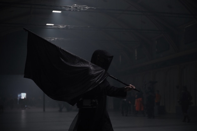 There are two distinct phases in Token Armies. The first has a cast of human/hybrid/machines working both purposefully and chaotically in groups or swarms. They tremble at the alter of a huge hovering tank-like machine (that reminded me of a garbage truck); they run, drag limp bodies, swerve. A horse is ridden through the landscape, a woman runs with a bird of prey, a tethered dog is patrolled around the vast arena, human/machine hybrids are guided through the havoc. A more concrete or clearly declared sense of purpose or shared effort might have helped create suspense or intrigue in the audience during this section. As it was, this was a very extended episode that didn't contain enough development.