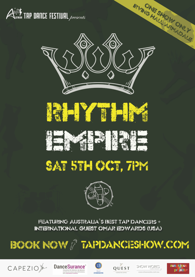 We have three Australian Tap Dance Festival prize packs to give away! Each pack includes a double pass to see the festival gala 'Rhythm Empire' on October 5, plus a Rhythm Empire singlet.